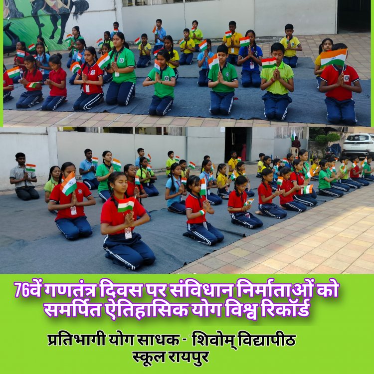 रायपुर : महादेव घाट रायपुरा, रायपुर में स्थित शिवोम विद्यापीठ इंग्लिश मीडियम स्कूल जहां शिक्षा ,संस्कार,और अनुशासन से परिपूर्ण है, साथ ही साथ योग के क्षेत्र में अपनी प्रतिभा को दिखा रहें है । 25 जनवरी 2025 को हुए मास योग वर्ल्ड रिकॉर्ड इवेंट एक रिकॉर्ड हमारे वीर शहीदों को समर्पित