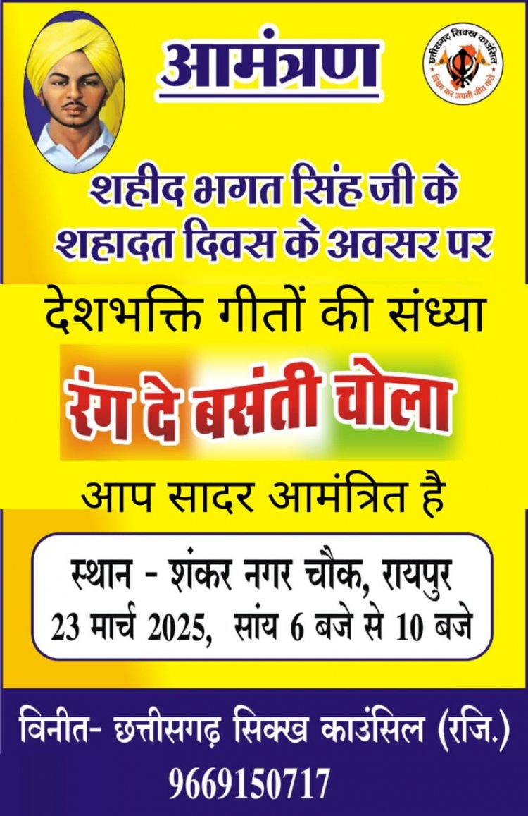 रायपुर : छत्तीसगढ़ सिक्ख काउंसिल द्वारा मेरा रंग दे बसंती चोला देशभक्ति गीतों का कार्यक्रम, छत्तीसगढ़ सिक्ख काउंसिल द्वारा शहीदे आजम सरदार भगत सिंह सुखदेव और राजगुरु की शहादत 23 मार्च को सुबह 11 बजे माल्यार्पण अर्पित कर श्रद्धांजलि अर्पित की जाएगी संध्या 6 बजे से देशभक्ति गीतों की संध्या मेरा रंग दे बसंती चोला कार्यक्रम का आयोजन शंकर नगर भगत सिंह चौक प्रतिमा स्थल के पास किया जाएगा