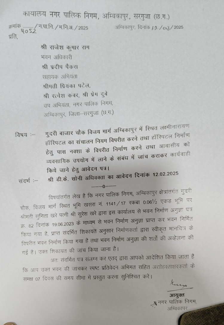 अंबिकापुर : मामला गुदरी बाजार चौक विजय मार्ग अंबिकापुर में स्थित लक्ष्मीनारायण हॉस्पिटल का संचालन नियम विपरीत करने तथा हॉस्पिटल निर्माण हेतु पास नक्शा के विपरीत निर्माण करने तथा आवासीय को व्यावसायिक उपयोग में लाने के संबंध में डॉक्टर डी.के. सोनी अधिवक्ता एवं आईटीआई कार्यकर्ता के द्वारा दिनांक 12/2/2025 को एक शिकायत आवेदन मय दस्तावेज के साथ आयुक्त सरगुजा संभाग अंबिकापुर के समक्ष प्रस्तुत किया गया था जिसमें यह लेख किया गया था कि गुदरी चौक विजय मार्ग में स्थित भूमि खसरा नंबर 1141/17 रकबा 0.06 हेक्टेयर 1/2 एकड़ भूमि श्रीमती सुनीता खरे पत्नी सुरेश खरे के नाम से नजूल भूमि है।