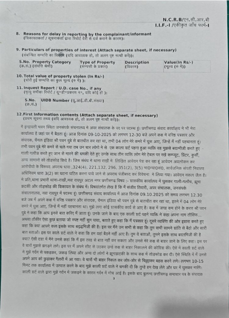 छत्तीसगढ़ जनसम्पर्क अधिकारी संघ के अध्यक्ष तंबोली ने इस घटना को योजनाबद्ध और सोची-समझी साजिश करार दिया। उन्होंने कहा कि हमलावरों का एक साथ शासकीय कार्यालय में घुसना, वरिष्ठ अधिकारी के साथ अभद्रता करना, सरकारी संपत्ति को क्षतिग्रस्त करना और खुलेआम धमकियां देना इस बात का प्रमाण है कि कुछ असामाजिक तत्व पत्रकारिता की आड़ में गुंडागर्दी कर रहे हैं।